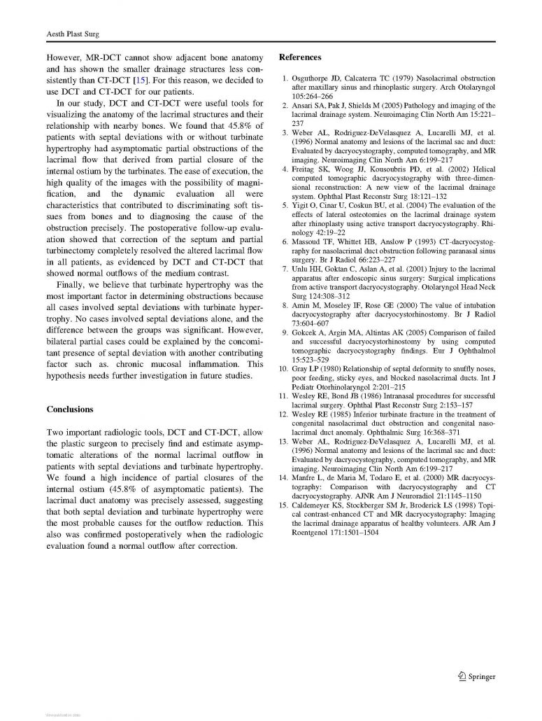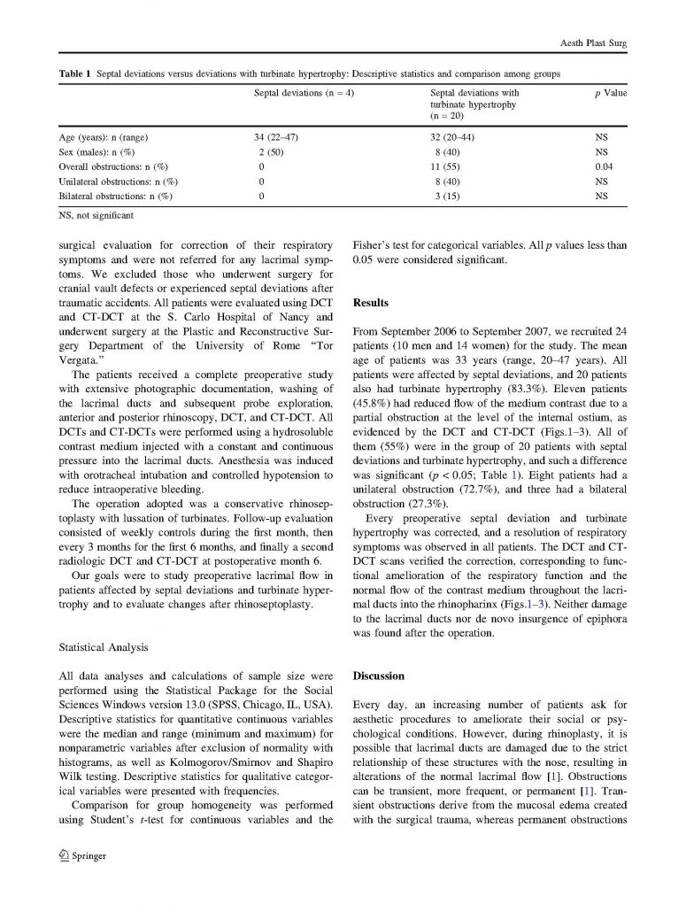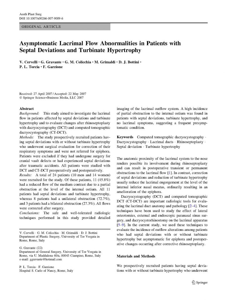 Sei in: Home / Blog Oculistica e Microchirurgia Oculare / Pubblicazioni / Asymptomatic Lacrimal Flow Abnormalities in Patients with Septal Deviations...